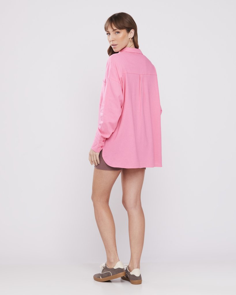 Sua modelagem ampla conta com bolso frontal discreto, bordado minimalista da marca e vista com fechamento por botões.